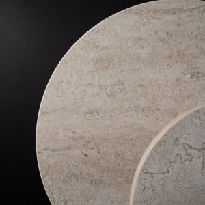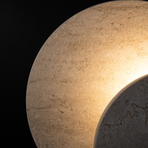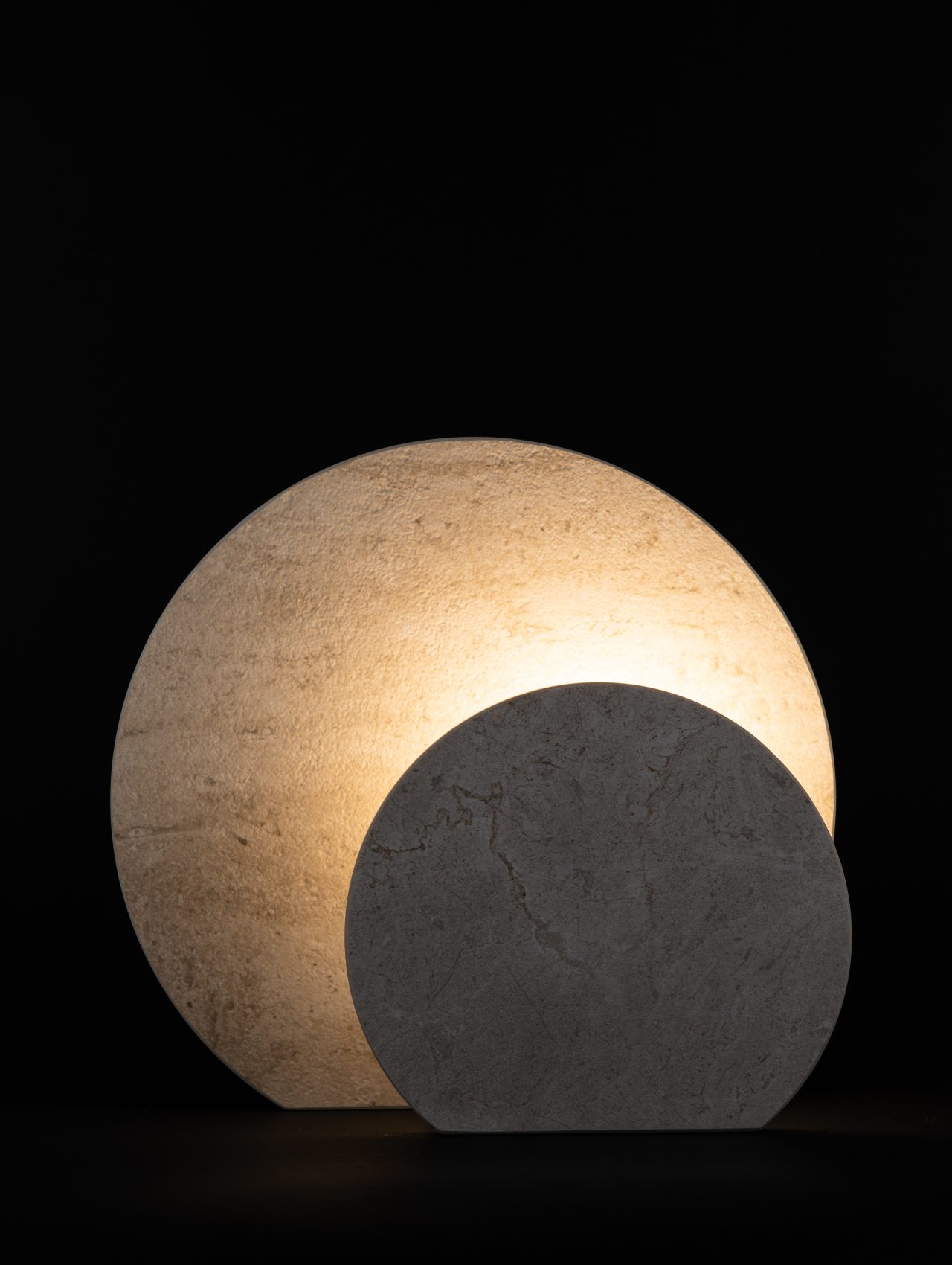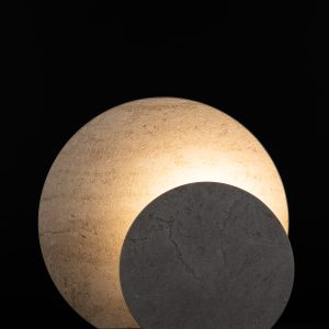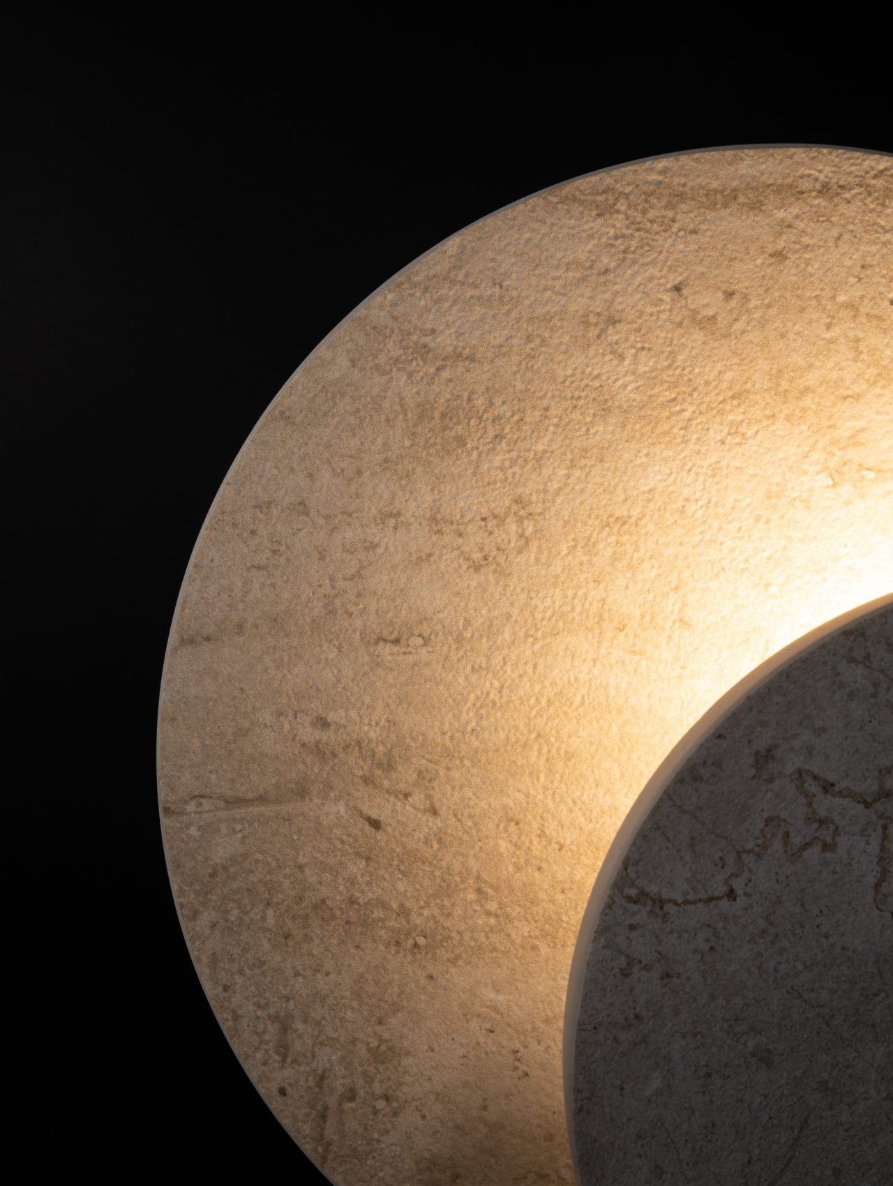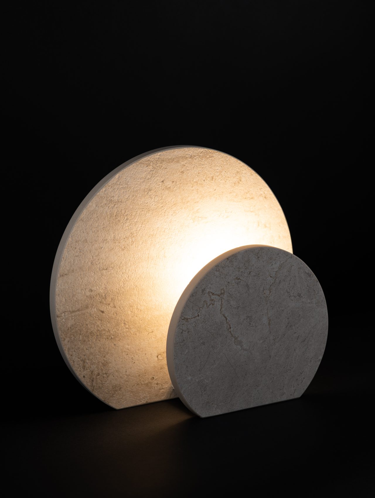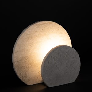 Travertino She lampa je dio kolekcije Shining Shadow inspirirana prirodnim izgledom travertina. Svaka lampa sastoji se od dvije paralelne ploče – manje sprijeda i veće straga. Između njih je skrivena žarulja. Budući da je svjetlo usmjereno prema većoj stražnjoj površini, prednja ostaje u sjeni. Iz toga proizlazi naziv Shining Shadow. Svaka lampa je ručno obrađena i sastavljena, te nijanse razlikuju svaku pojedinačnu lampu. Tekstura kamena, linije i reljef na svakoj lampi su drugačiji.
