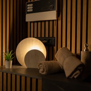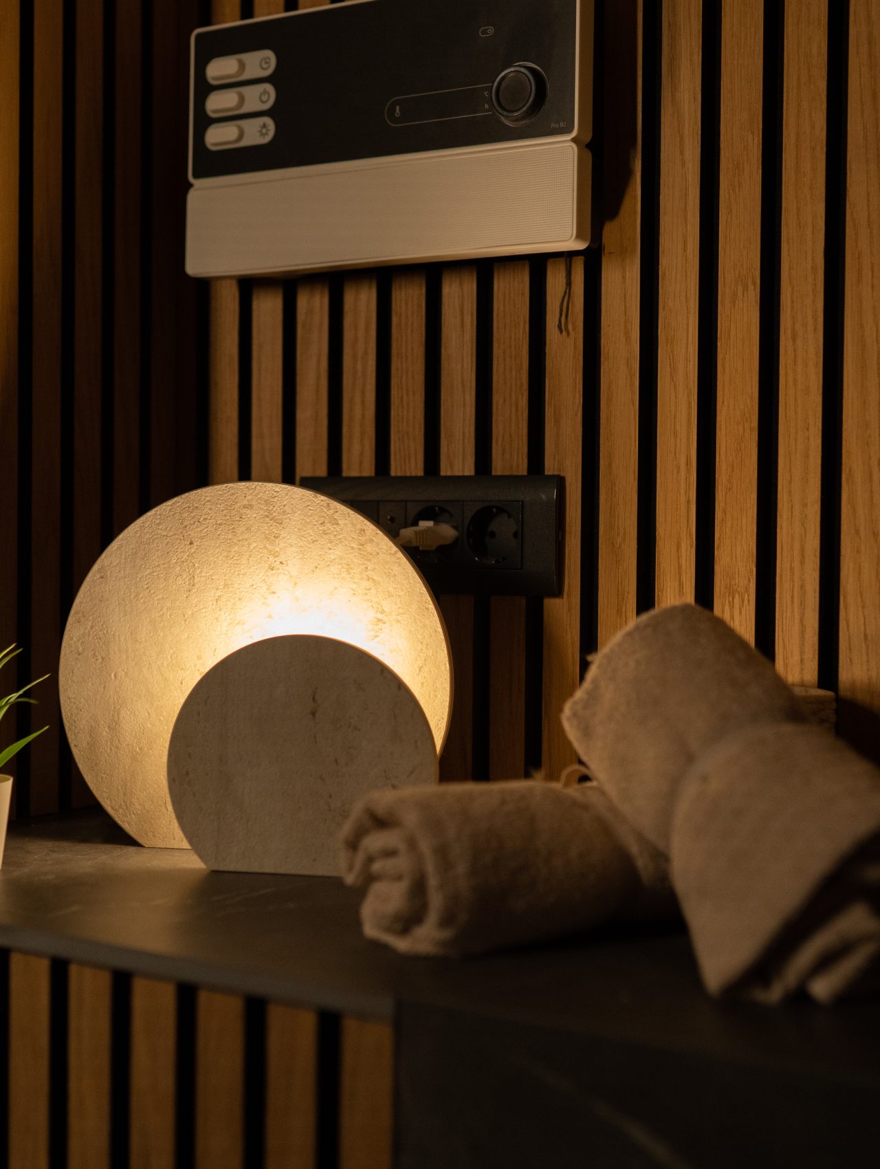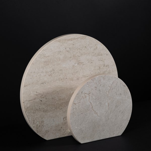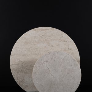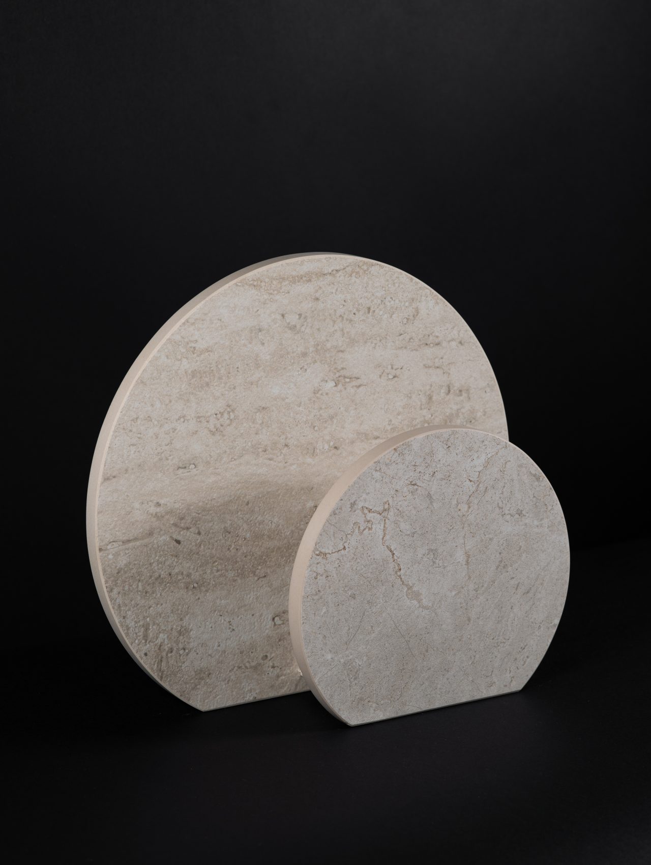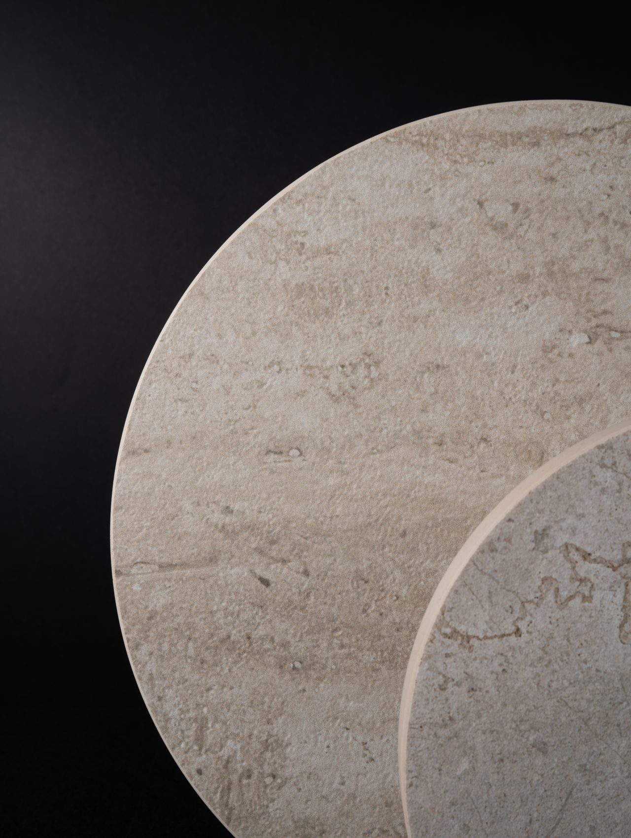 Travertino She lampa je dio kolekcije Shining Shadow inspirirana prirodnim izgledom travertina. Svaka lampa sastoji se od dvije paralelne ploče – manje sprijeda i veće straga. Između njih je skrivena žarulja. Budući da je svjetlo usmjereno prema većoj stražnjoj površini, prednja ostaje u sjeni. Iz toga proizlazi naziv Shining Shadow. Svaka lampa je ručno obrađena i sastavljena, te nijanse razlikuju svaku pojedinačnu lampu. Tekstura kamena, linije i reljef na svakoj lampi su drugačiji.