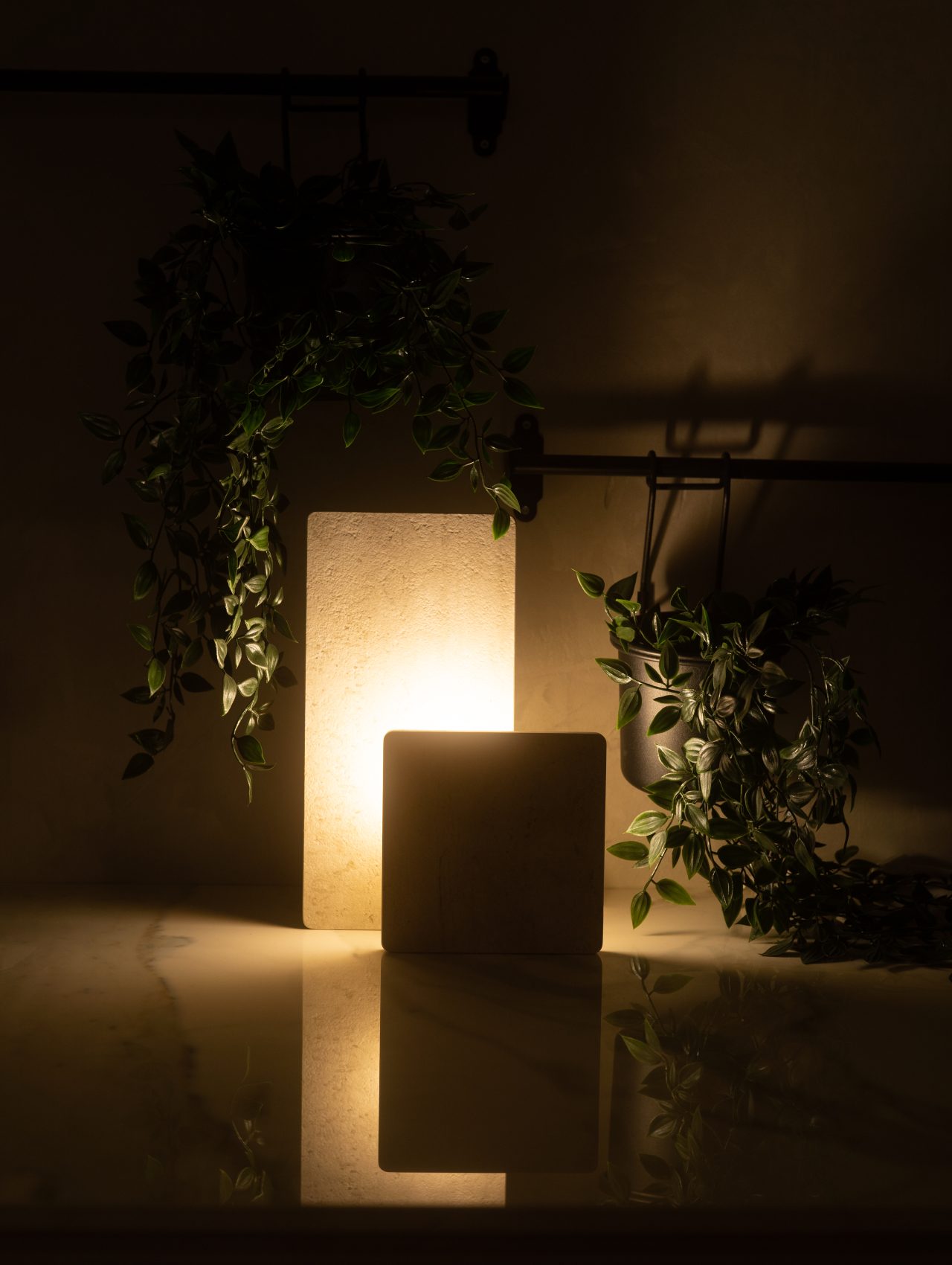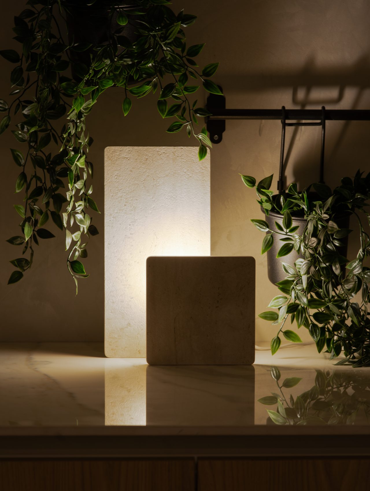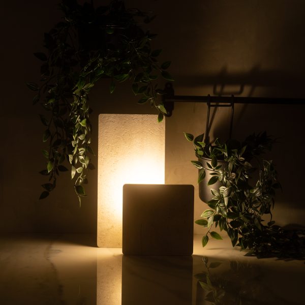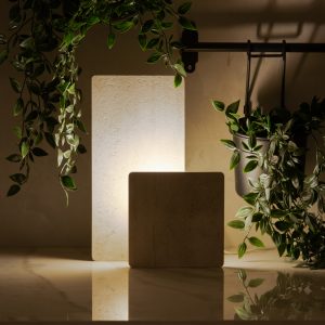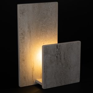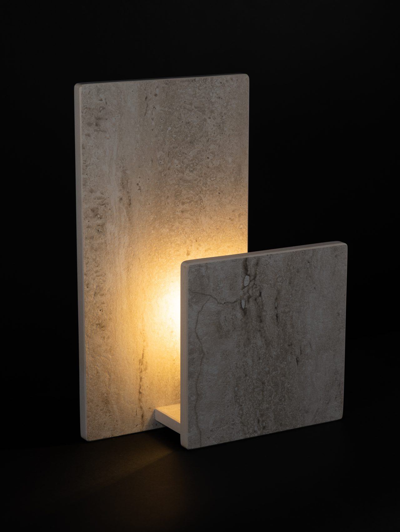 Travertino He lampa je dio kolekcije Shining Shadow inspirirana prirodnim izgledom travertina. Svaka lampa sastoji se od dvije paralelne ploče – manje sprijeda i veće straga. Između njih je skrivena žarulja. Budući da je svjetlo usmjereno prema većoj stražnjoj površini, prednja ostaje u sjeni. Iz toga proizlazi naziv Shining Shadow. Svaka lampa je ručno obrađena i sastavljena, te nijanse razlikuju svaku pojedinačnu lampu. Tekstura kamena, linije i reljef na svakoj lampi su drugačiji.