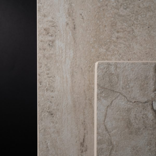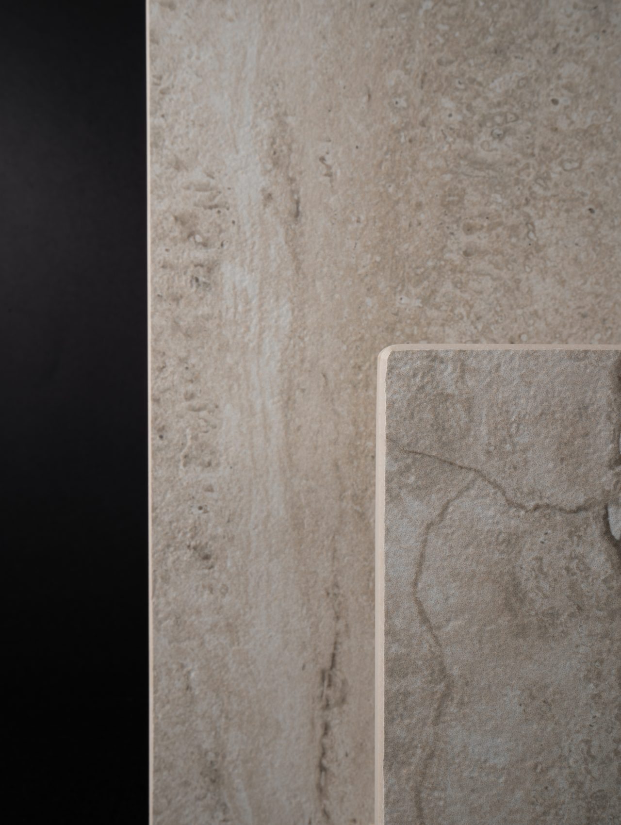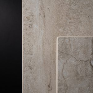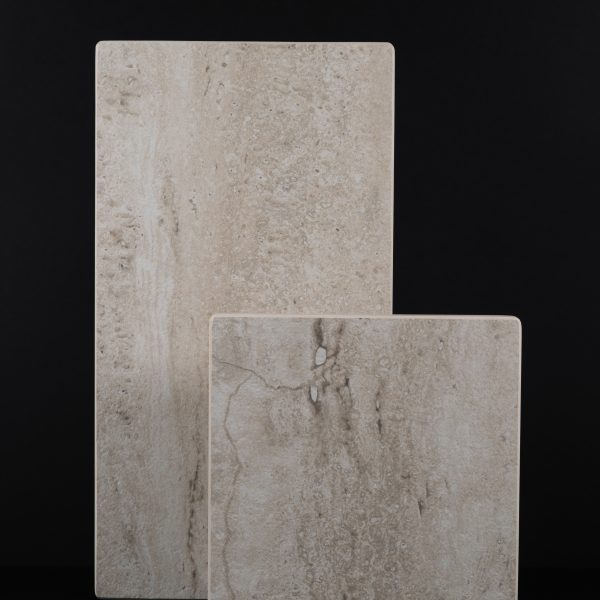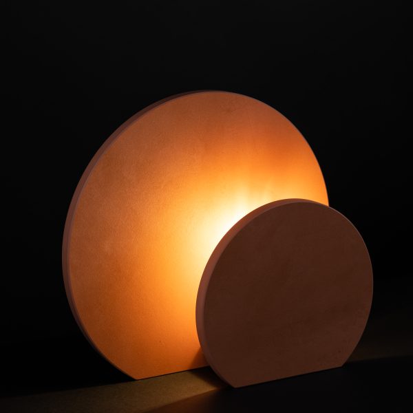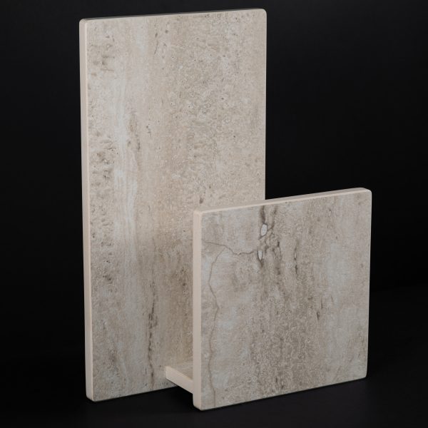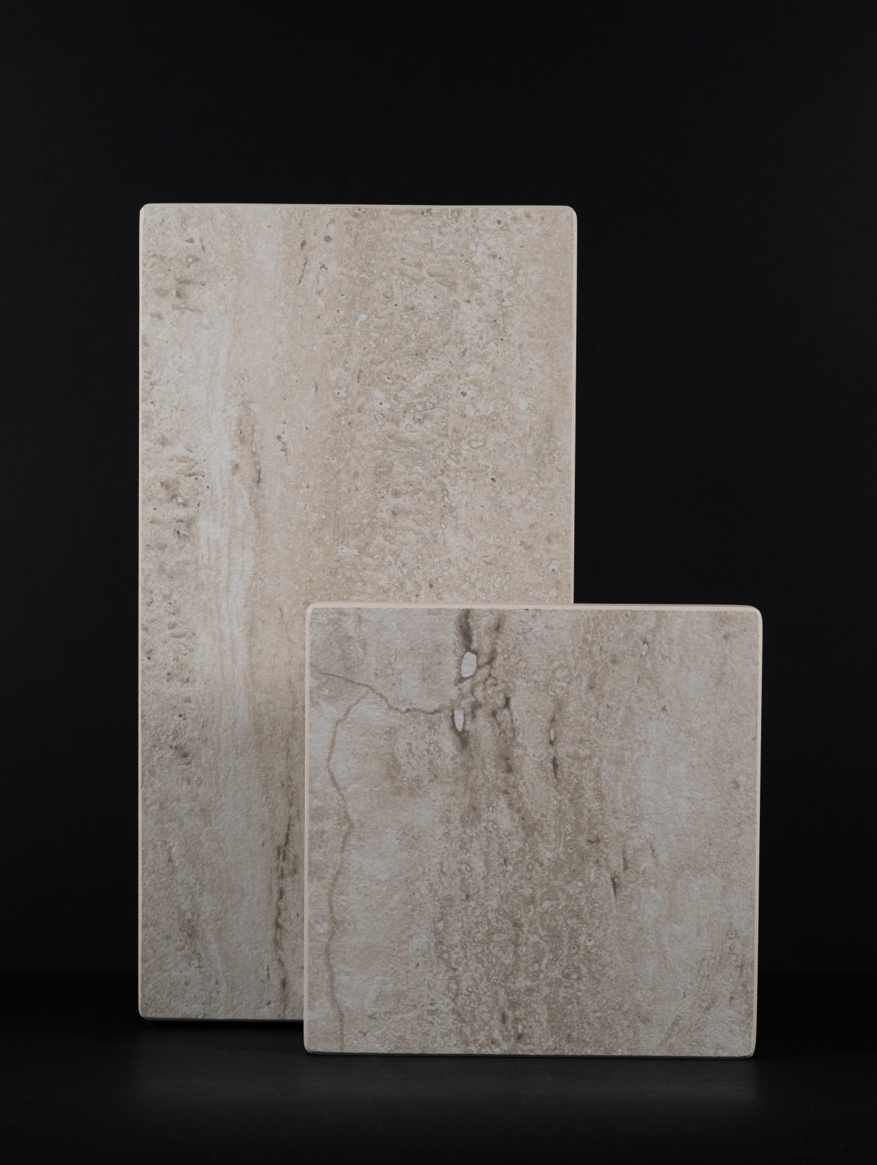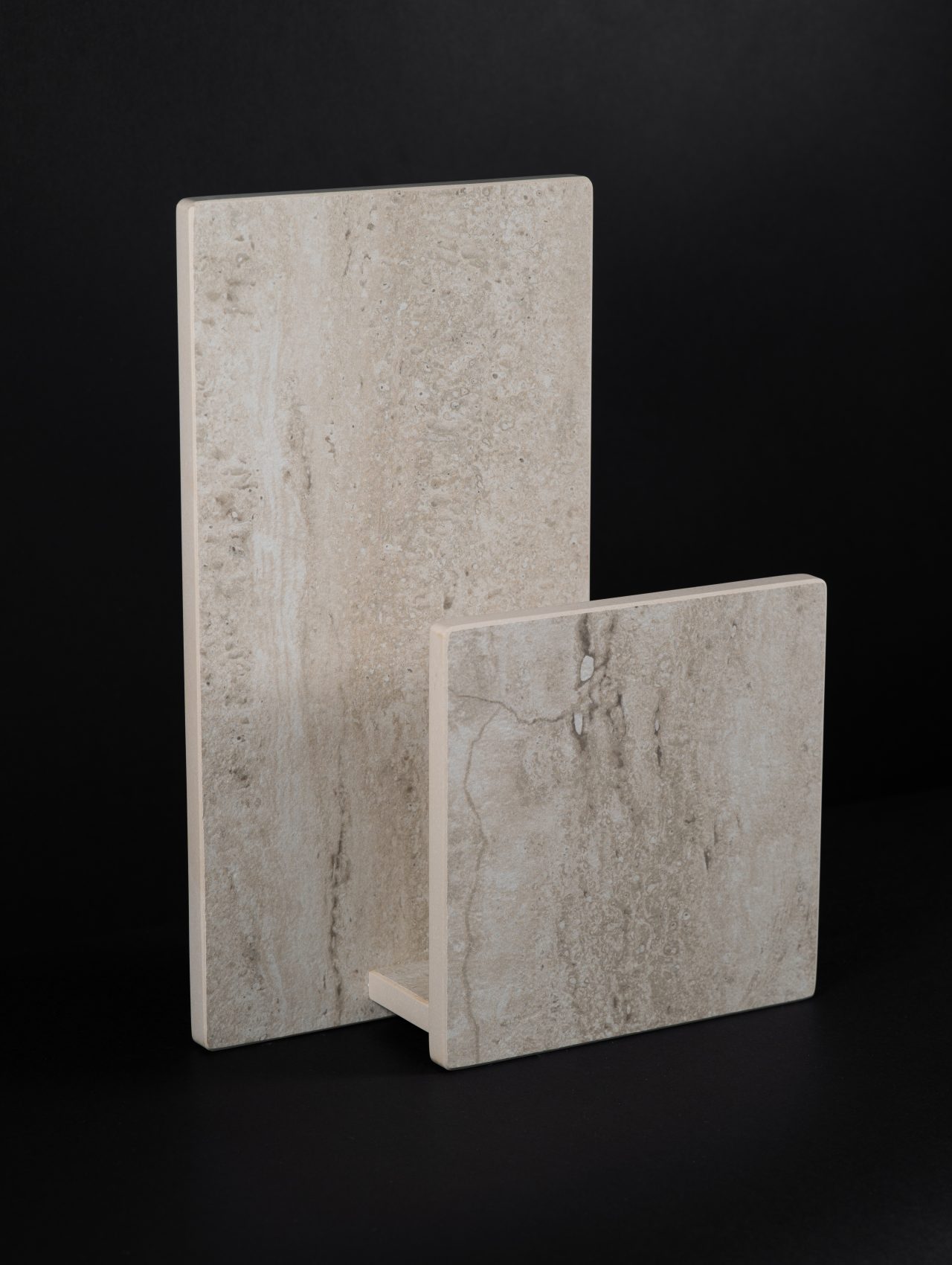 Travertino He lampa je dio kolekcije Shining Shadow inspirirana prirodnim izgledom travertina. Svaka lampa sastoji se od dvije paralelne ploče – manje sprijeda i veće straga. Između njih je skrivena žarulja. Budući da je svjetlo usmjereno prema većoj stražnjoj površini, prednja ostaje u sjeni. Iz toga proizlazi naziv Shining Shadow. Svaka lampa je ručno obrađena i sastavljena, te nijanse razlikuju svaku pojedinačnu lampu. Tekstura kamena, linije i reljef na svakoj lampi su drugačiji.